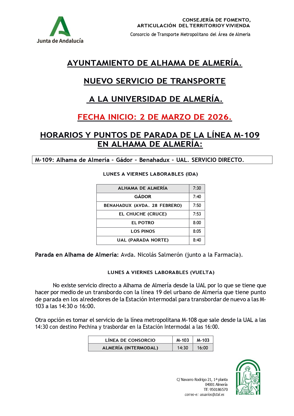 El día 2 de marzo de 2026 comienza el nuevo servicio de transporte directo a la Universidad de Almería.