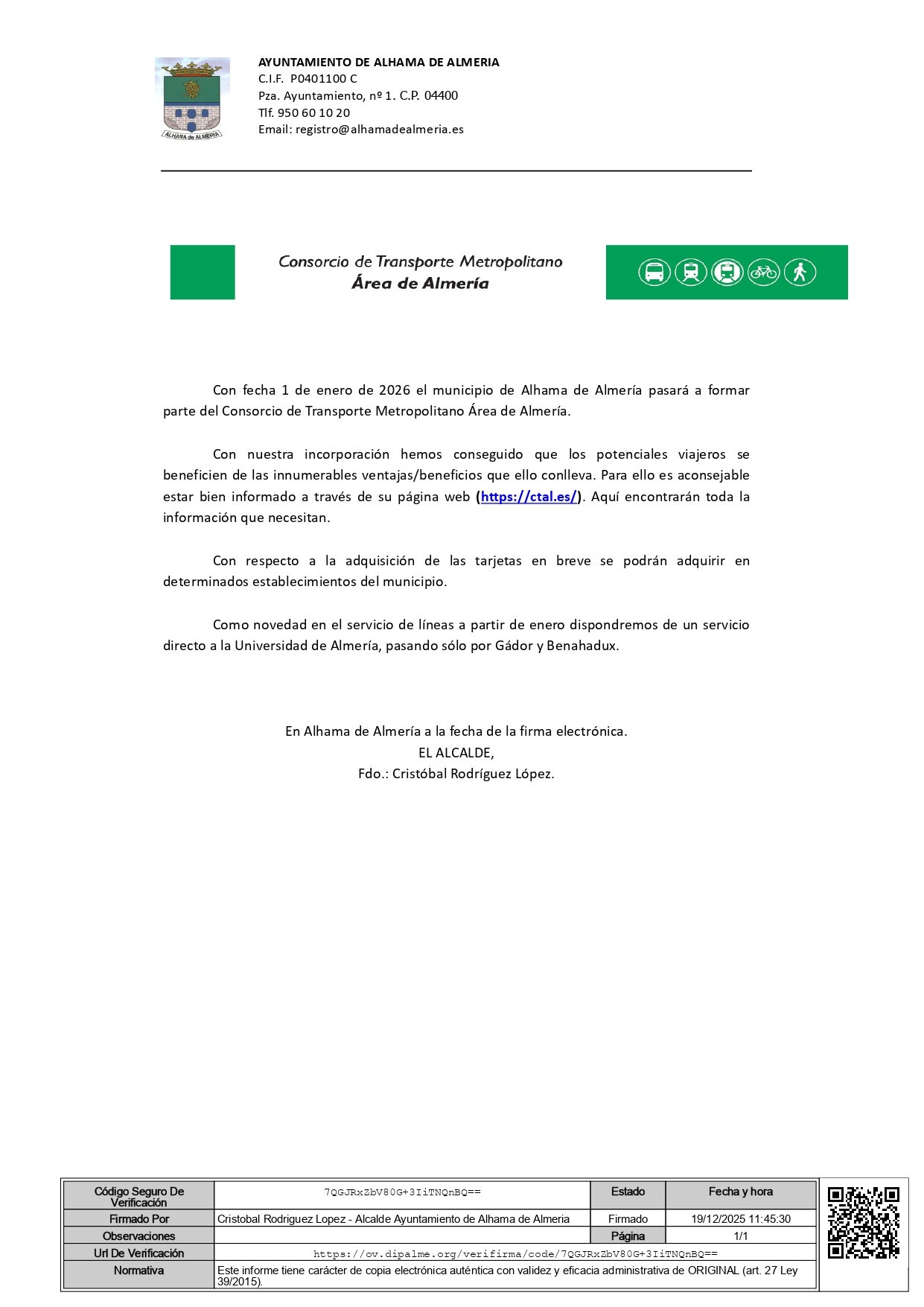 Desde el 1 de enero de 2026 Alhama de Almería forma parte del Consorcio de Transporte metropolitano Área de Almería.