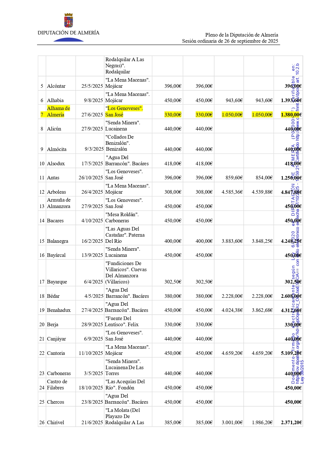 ALHAMA DE ALMERÍA HA RECIBIDO LA CANTIDAD DE 1380,00 PARA SUFRAGAR EL TRANSPORTE DE JDP Y SENDEROS
